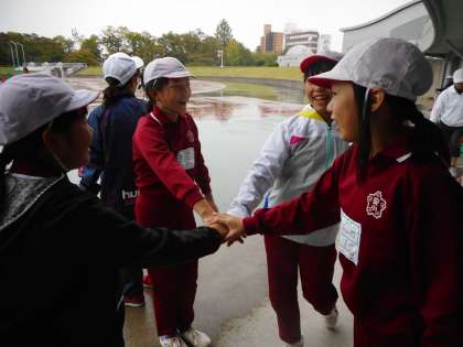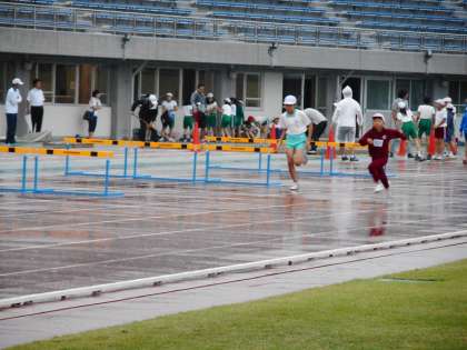 種目に分かれて他校の選手のみなさんと一緒に練習しました。途中から雨が大つぶになってきましたが、女子のリレーメンバーの気合いが勝っておりました。