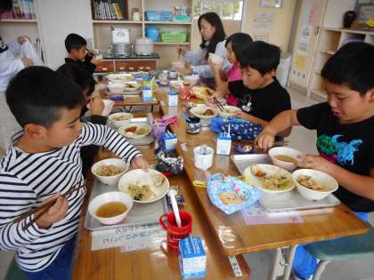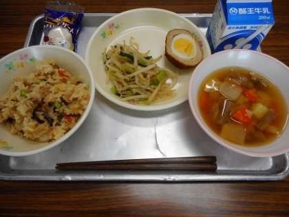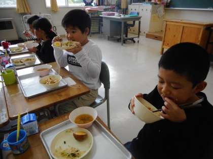 今日の給食は、お月見献立。「枝豆入りまぜご飯、牛乳、お月見スコッチエッグ、野菜のおひたし、根菜汁、お月見デザート」です。彩りよい枝豆まぜご飯に、お月さまに見立てたスコッチエッグが一段と食欲をそそります。児童の皆さんは、おいしそうにお月見メニューをほおばっていました。今夜は、お月見には残念な天気ですが、3連休のうちに美しい月を眺めてみるのもいいですね。