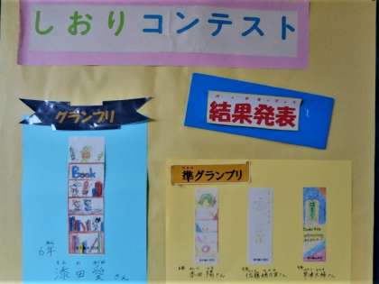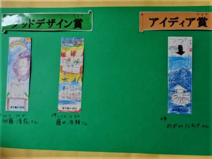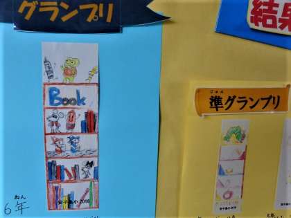 2018年「しおりコンテスト」の結果が発表されました。全校児童の皆さんの作品は、本への愛がいっぱいつまった素敵なしおりばかりでした。全員にグランプリ賞を贈りたいところですが・・・、投票の結果、みごと2018年しおりコンテストグランプリ賞は、6年添田さんの作品です。準グランプリ賞に6年本田君、5年佐藤さん、5年早津君、グッドデザイン賞に5年加藤さん、3年藤田君、アイディア賞に2年野川君が選ばれました。おめでとうございます。