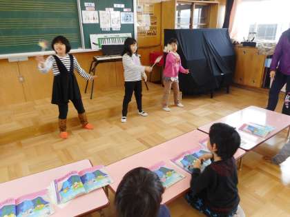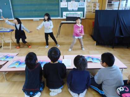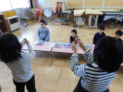 アンダソン作曲の「おどるこねこ」の曲にあわせて、体を動かしてみました。音楽の感じにあわせて、ゆっくりにしたりはやくしたり、身体を回転させてみたり、こねこたちがおどっているようすをおもいうかべて曲を鑑賞しました。
