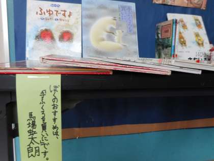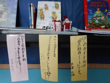 図書室前に並べられた12月おすすめ本。特におすすめの本を図書委員が選び、ポップを書いてくれました。どの本も今の季節にぴったりの本です。まだ読んでいない方は、ぜひ読んでみてください。