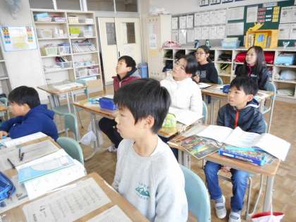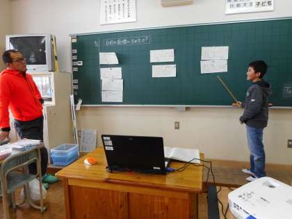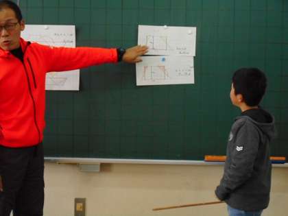 台形の面積をこれまで学習したことを使って求めようと考えた5年生。自分の考えを図や式を使って書いてみました。友達に自分の考えを説明すると、友達の考えと同じだったり、違いがはっきりしたりして、いろいろな求め方があることがわかりました。