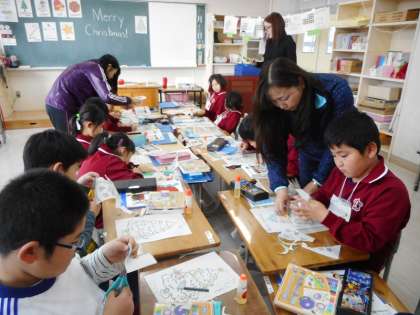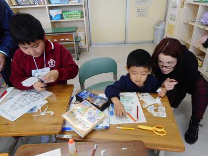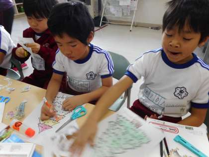 1・2年生は、クリスマスツリーに飾るグッズを英語で発音練習したあと、友達と交換できるように、形を切りぬき色を塗りました。発音しながら、オリジナルグッズができあがりました。