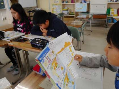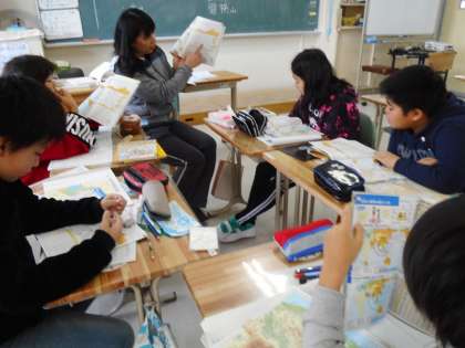 私たちの県、福島県の地形や土地利用を調べた4年生。他県に目を向け、地図帳を広げて日本全体で見ると、いろいろなことに気づきました。