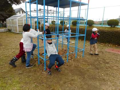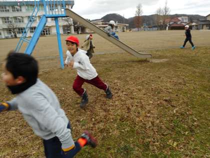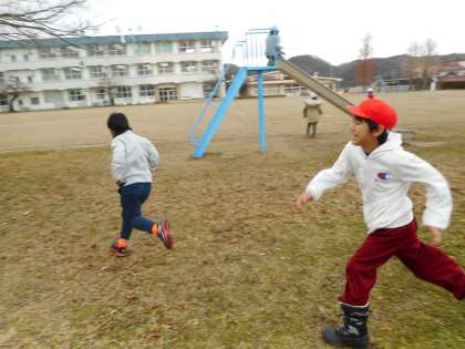 今日は、久しぶりの校庭で遊べる昼休み。1年生から6年生までが集まって鬼ごっこです。寒さを忘れて、本気で「ケイドロ」をする姿は、競技となっています。
