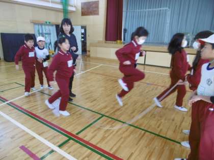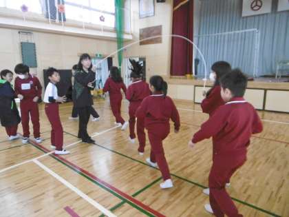 目標の200回を超えてきた3・4年生。作戦を練りながら、友達のタイミングをとって背中を押したり、順番を変えたりとがんばっています。