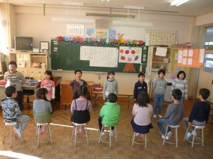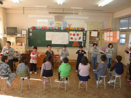 新入生が元気に4月を迎えられるように、応えんダンス「マルマルモリモリ」を踊りました。ノリノリで踊った2年生の姿を見て、緊張していた新入生も笑顔。このあと、昔遊びやおえかきを一緒にして楽しい時間を過ごしました。
