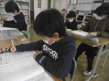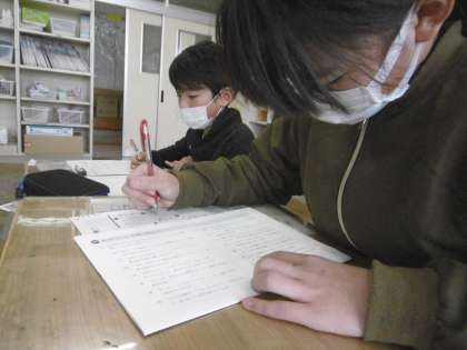 テストは、できなかったところをはっきりさせ、そのできなかったところをできるようになるいいチャンス。この機会を逃すまいと、まちがったところを一問ずつ見ていきながら、「なぜできなかったのか」確認した5年生。これからまだまだ伸びます。