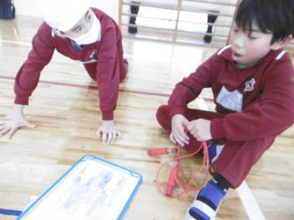 なわとび個人カードで、自分の今の力を確認した5・6年生。次にクリアしたい個人目標を設定しました。努力あるのみです。