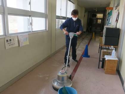 教室や廊下の床の汚れが目立ち始めたので、用務員さん、スクールサポートスタッフさん、養護教諭の先生が、放課後の時間に教室や廊下の汚れ落としをして、ワックス塗りをしてくださっています。見違えるほどきれいになりました。ありがとうございます。