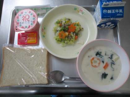 1年生が学校給食デビューです。今日の献立は「食パン いちご&マーガリン 牛乳 ホワイトシチュー キャベツサラダ お祝いデザート」でした。