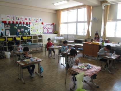 「初めての給食はいかがでしたか?」とたずねると、「とってもおいしかったです!!」とうれしいお返事をもらいました。