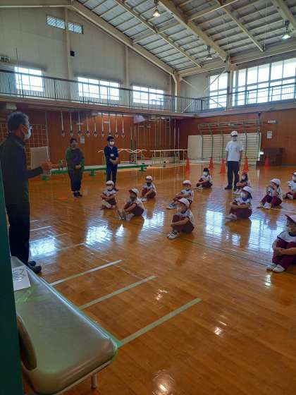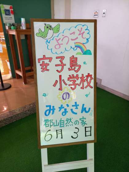 自然の家に到着した1・2年生です。素敵な看板で迎えていただきました。出会いのつどいの様子です。