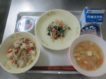 今日の献立は「きのこごはん 牛乳 小松菜のあえもの 豆腐のみそ汁 ブルーベリーゼリー」でした。きのこがたっぷり入った味ご飯は秋らしさを感じさせます。