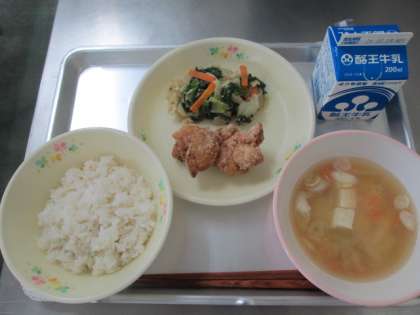 今日の献立は「麦ごはん 牛乳 鶏肉の立田揚げ ほうれん草のごまあえ えのき茸のみそ汁」でした。大きな立田揚げをおいしそうに頬張る子どもたちでした。