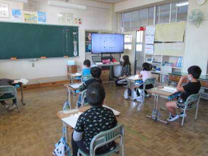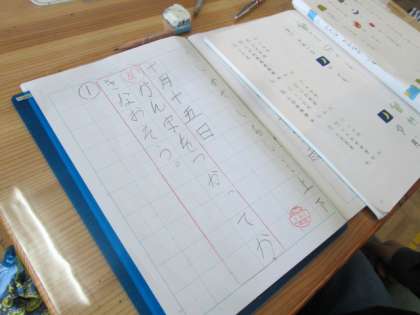 1年生の国語です。絵であらわされているものを漢字に直す学習です。ノートにもきれいな文字でめあてが書かれていました。たくさんの絵を漢字に直すことはできたかな。