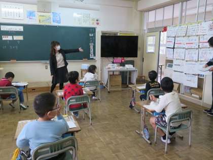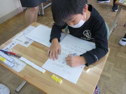 2校時目に1年生の算数の授業研究を行いました。6人の1年生は繰り上がりのたし算の学習に熱心に取り組むことができました。「3+9」をどのように解くかを、ブロックを使ったり、数字をワークシートに記入したりと、まずは自分で解く方法を考えました。
