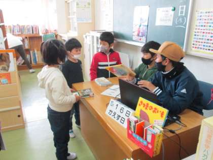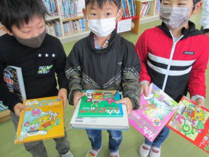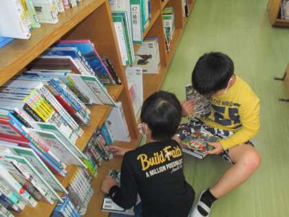 週末に読む本2冊を借りに図書館は賑わいました。1年生は動物・恐竜図鑑を、2年生はそろって九九の本を借りていました。算数で九九の学習が始まっているからですね。