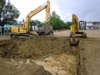 表土の仮埋設作業が始まりました。雨の中ですが、作業員の方々は作業をして下さっています。