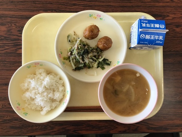 今日のメニューは、ご飯、なめこ汁、県産鶏の彩野菜肉団子、海苔と野菜のあえものです。