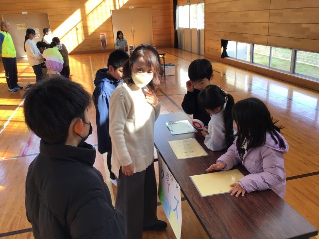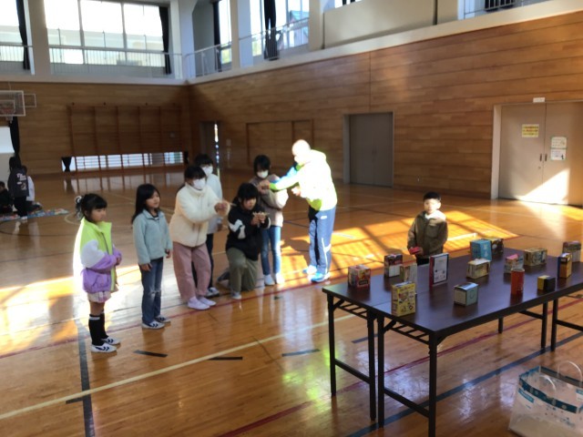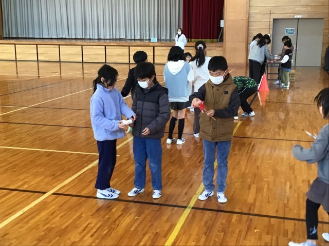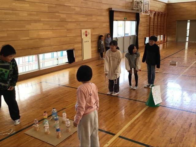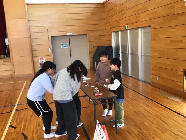来週、実施する予定のせいわ園への訪問のために1、2、3年生が準備したゲームを全校で楽しみました。せいわ園の皆様と一緒に楽しく交流できるよう射的や魚釣りなどのゲームを児童が手作りで準備しました。