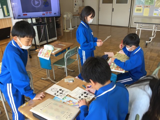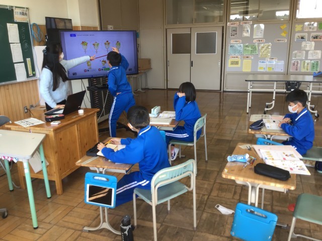 4年生の外国語活動では、お店屋さんとお客さん分かれて”How do you want?”から始まる英文のやりとりを練習しました。聞かれたお客さん側の児童は“I want ~.”と元気に答えていました。