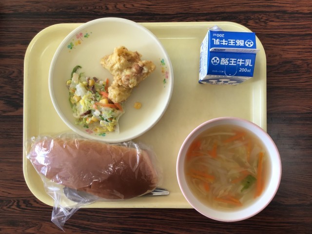今日のメニューは、黒糖パン、フライドチキンカレー風味、コールスロー、コンソメスープです。