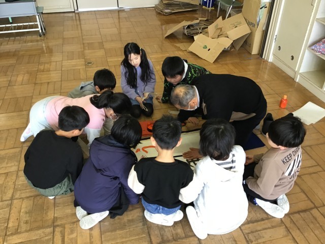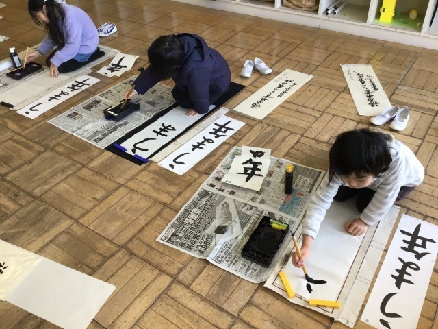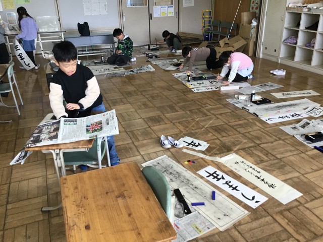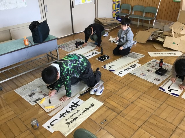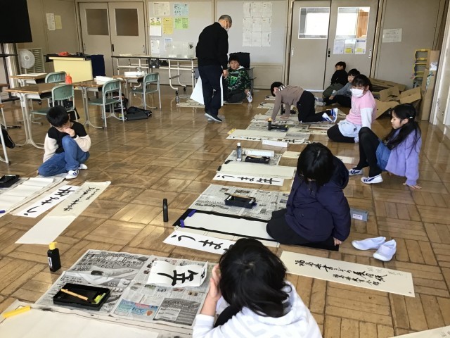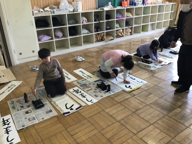 3年生対象の書き初め教室です。書き初め用の長い半紙に、床の上で書くことは初めての経験です。字の大きさやバランスに注意しながら、練習していました。