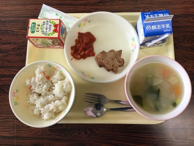 2学期最後のメニューは、コーンピラフ、ハンバーグ、豆のトマト煮込み、野菜スープ、チョコデザートです。今日はクリスマス献立でした。今年もあと10日、いよいよ冬休みです。冬休み中も規則正しい食生活を心がけ、健康に過ごしましょう。