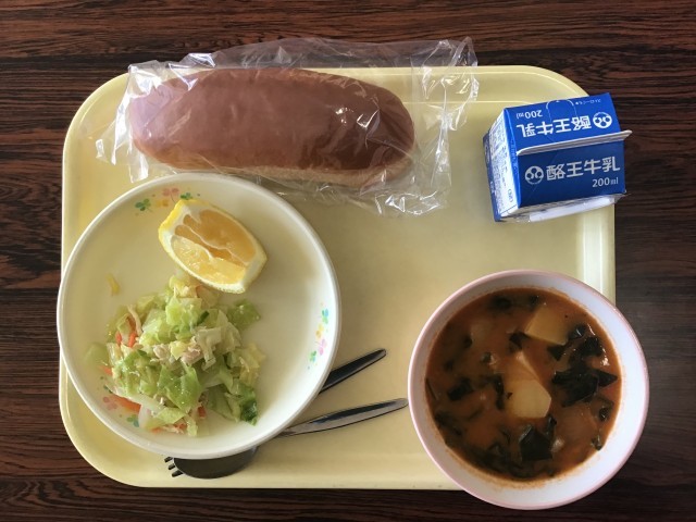 今日のメニューは、黒糖パン、チキンのサラダ、トマトクラムチャウダー、はるかです。