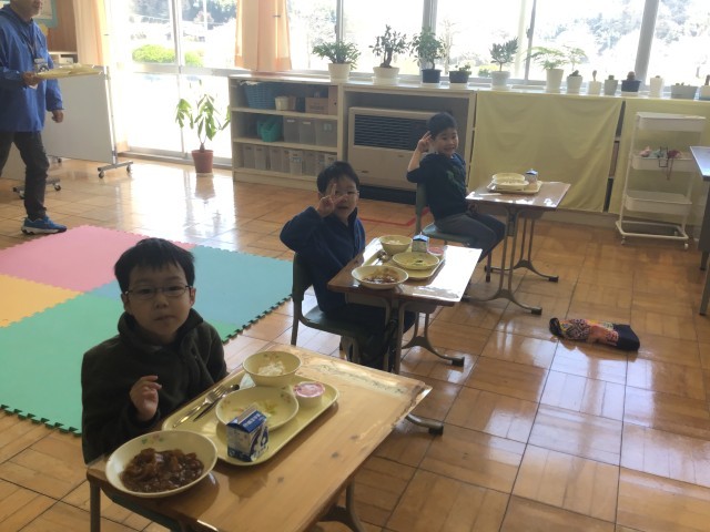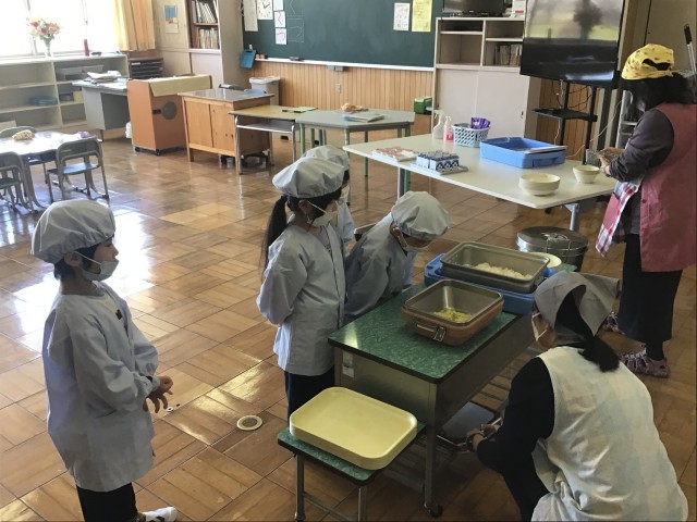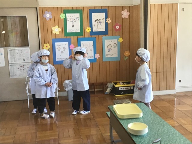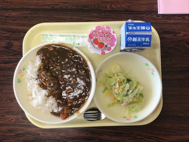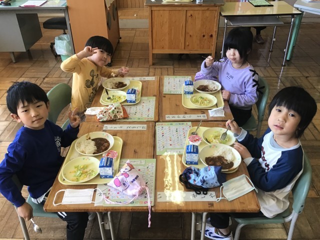 今年度最初の給食です。カレーライス、キャベツサラダ、いちごゼリーです。一年生にとって小学校最初の給食。慣れないエプロンを着て準備しますが、何をしたらいいか分からず、戸惑う様子も見られます。少しずつ慣れていき自分たちでできるようになる時が楽しみです。