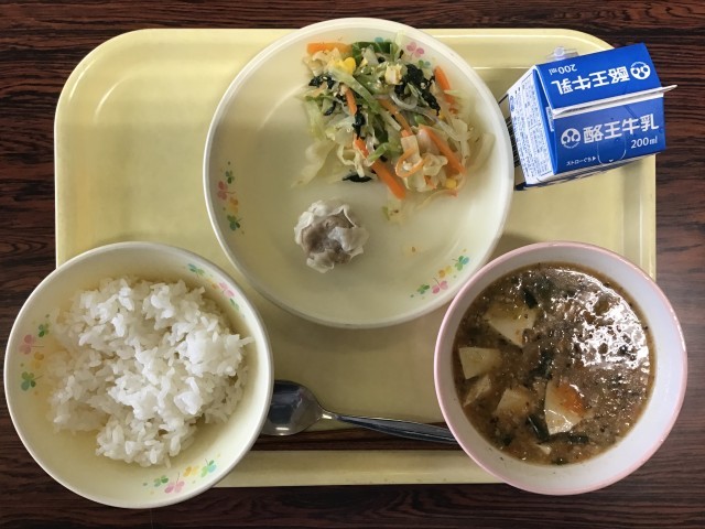 今日のメニューは、ご飯、麻婆豆腐、シューマイ、バンサンスーです。