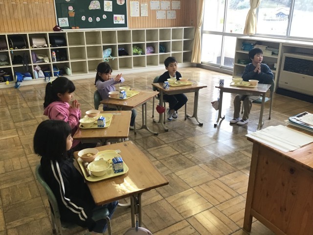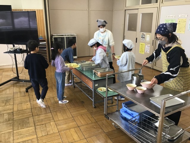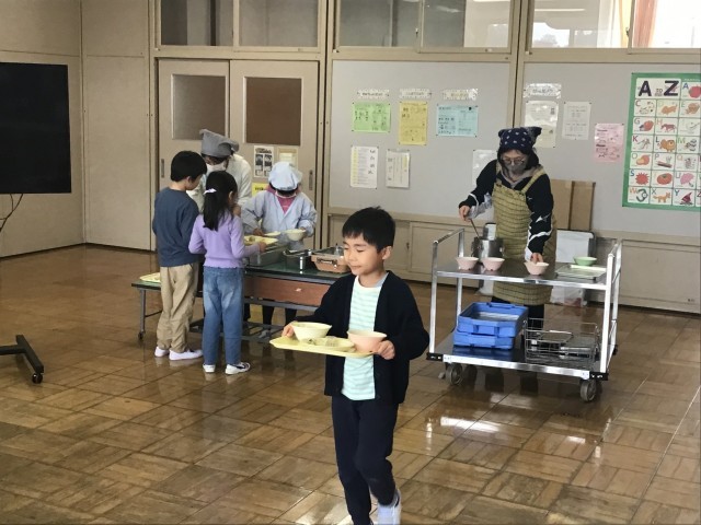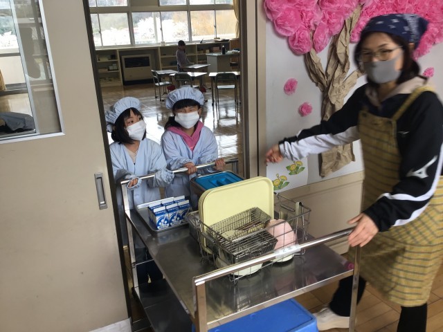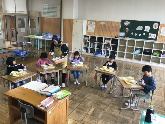 今日は2年生の給食の様子です。みんなで協力して、手際よく準備できました。5人で美味しく食べています。