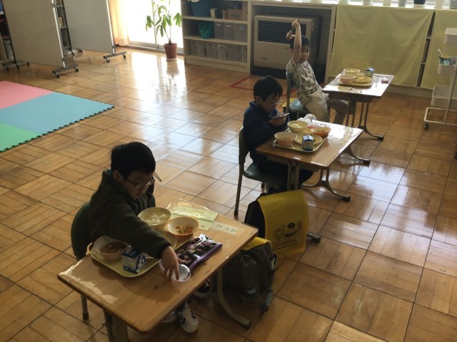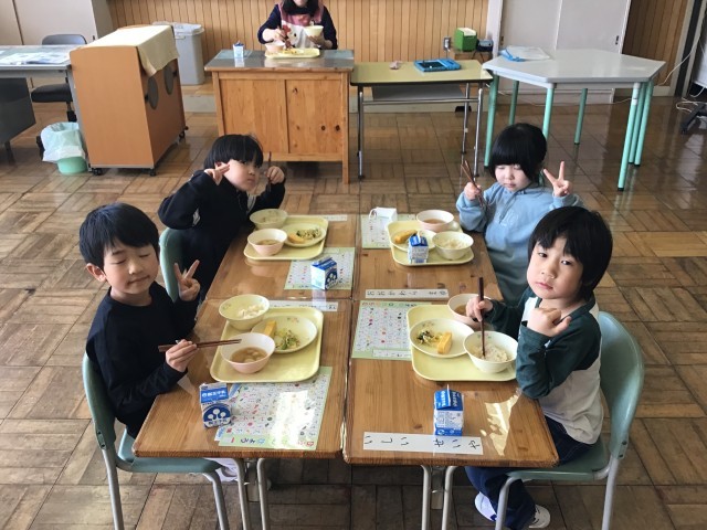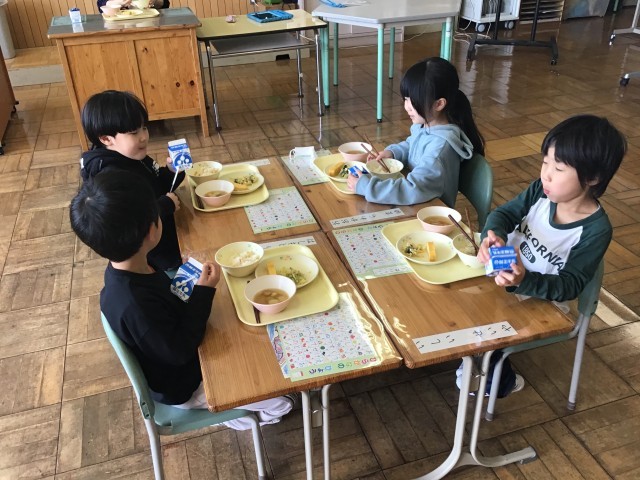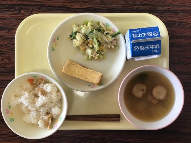 今日のメニューは、筍ご飯、大根と麩の味噌汁、厚焼き玉子、菜の花和えです。
