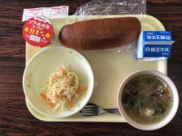 あさか舞ご飯、牛乳、味のり、豚汁、県産鶏つくねの甘酢あんかけ、ゴマ風味和え