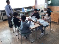 貝の絵ろうそく作りを行っています。貝の表面に色を塗り、中に溶かしたろうを入れてろうそくを制作する活動で、各自自分なりの思いを生かして制作しています。