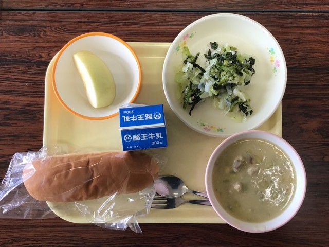今日のメニューは米粉パン、肉団子のクリーム煮、グリーンサラダ、りんごです。