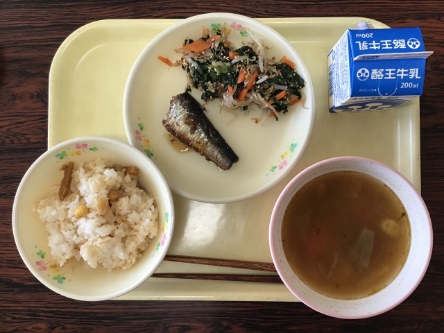 今日は、節分献立です。豆ご飯、豚汁、イワシの生姜煮、三食おひたしです。