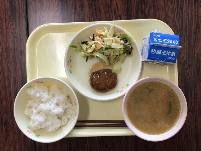 今日のメニューは、ご飯、南蛮汁、ハンバーグソースかけ、小松菜と玉子のあえものです...