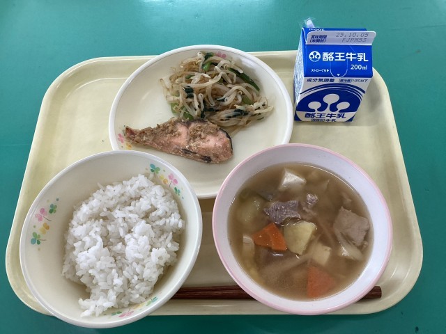 ごはん,牛乳,鮭の三味焼き,小松菜のからしあえ,豚汁