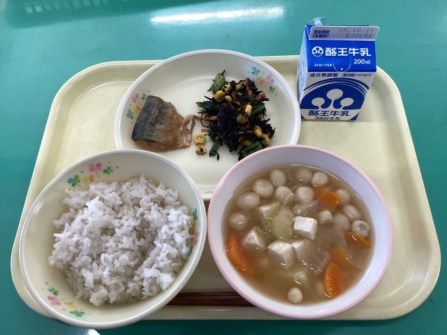 麦ごはん,牛乳,さばみそ煮,ひじき入りおひたし,豆腐と大根のみそ汁