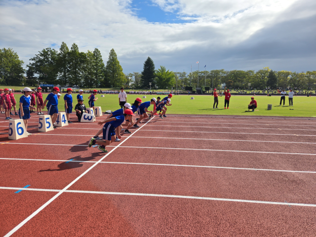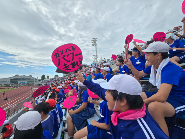 10月8日の陸上競技交歓会では、今までの練習で教えていただいたことや自分たちががんばってきたことを思い出しながら、全力で競技に挑みました。いよいよ競技のスタートが近づくと、とても緊張したようですが、友達と励まし合いながら、最後までがんばることができました。スタンドでは、応援団長のかけ声に合わせて、みんなで声がかれるほど声援を送りました。”応援うちわ”も大活躍!みんなで力を合わせて、一人一人が力を発揮することができたすばらしい陸上競技交歓会でした!応援ありがとうございました!