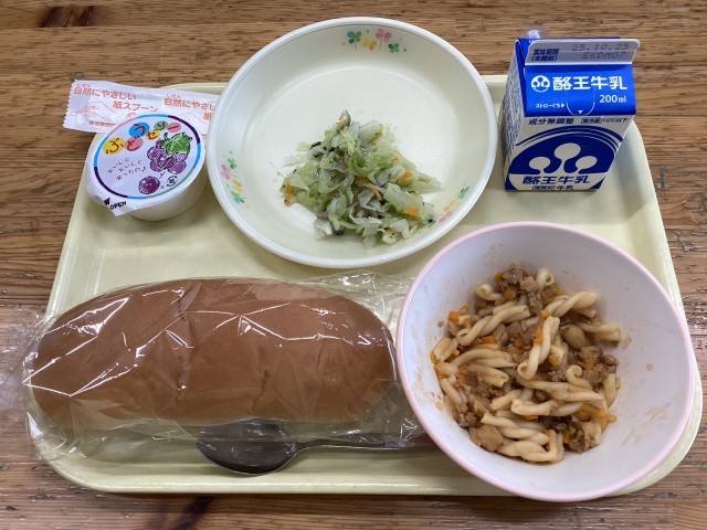 コッペパン,牛乳,マカロニのミートソース煮,キャベツとほうれん草のサラダ,ぶどうゼリー