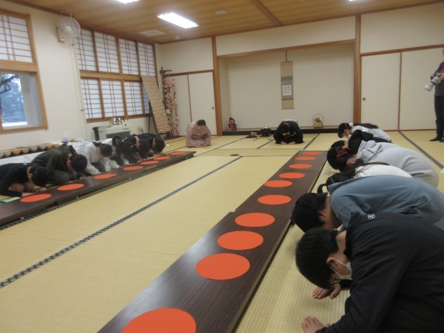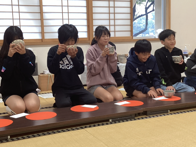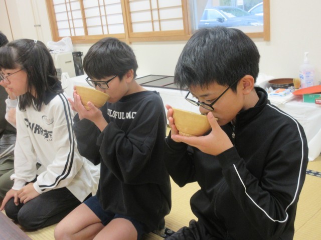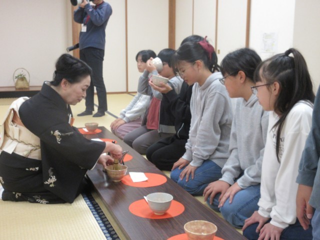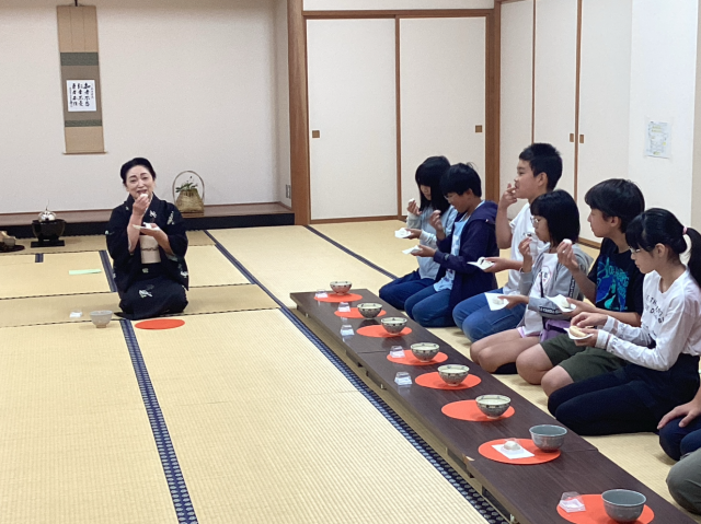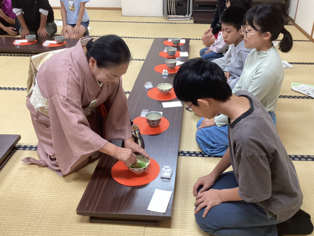 10月16日(木)に、講師の先生をお招きし、茶道教室が行われました。桃見台小学校の教育目標でもある「知・仁・勇」の教えをみんなで唱え、人として大切なことを改めて学ぶことができました。また、相手への敬意を表す「礼」についても教えていただき、「真・行・草」のお辞儀の仕方を教えていただきました。そして、室町時代から続く茶道の作法についてお話いただき、一人一人にお茶をたてていただきました。ちょっと大人の味わいだったようですが、お菓子とともにおいしくいただきました。とても貴重な体験をさせていただくことができ、子どもたちも自然と背筋がすっと伸び、静かでゆったりとした時間を過ごすことができました。