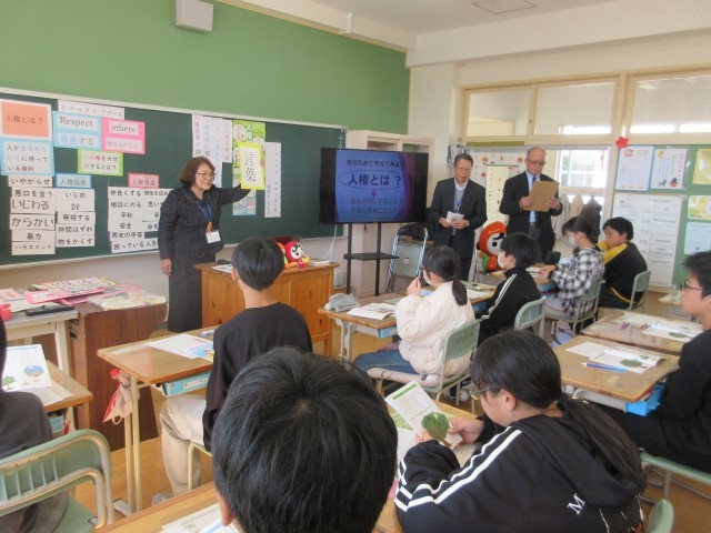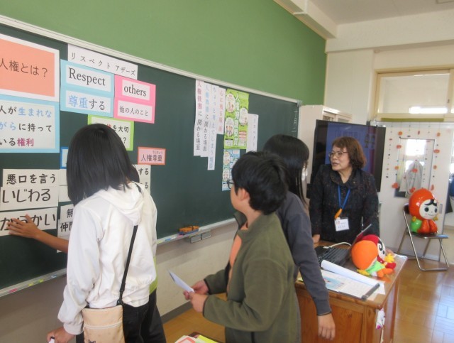 10月23日(木)に、人権擁護委員の皆様にお出でいただいて、人権教室を行いました。「人権とは?」という問いについて子どもたちは、「生まれながらに持っている権利」「自由に選択できること」など、これまでに学んだことをもとに一生懸命考えていました。人権教室の中で、「Respect others」(他者を尊重する)という考え方を学びました。当たり前のことのようですが、自分自身の生活に置き換えて考えてみると、「できていなかったかも…」と、改めてその大切さに気づくことができました。授業の終わりにもう一度「人権って?」という問いについて考えると、「相手の個性を認めること」「自分を大切にすること」「否定しないこと」などという考えが聞かれ、子どもたちの学びの広がりや深まりが伺えました。これからの自分の生活や人との関わりの中で、さらに「Respect others」について考えていけたらと思います。