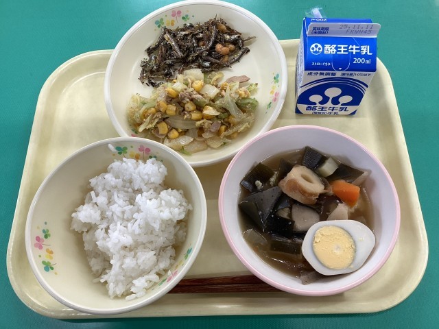 ごはん,牛乳,おでん,青のり小魚,焼き豚入りあえもの