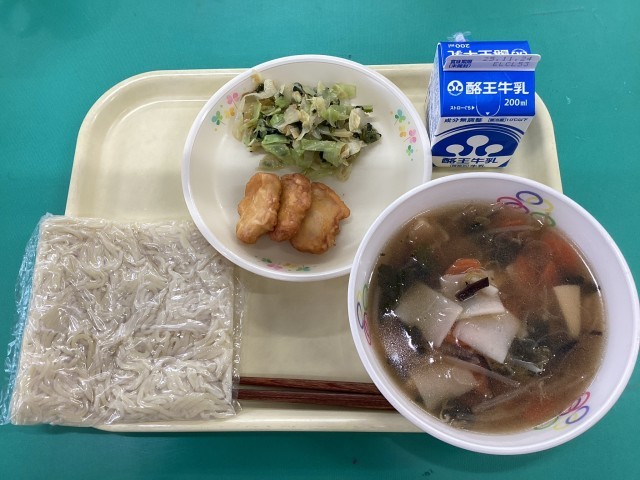 県産米粉ワンタンメン,牛乳,チキンナゲット,キャベツとほうれん草のナムル