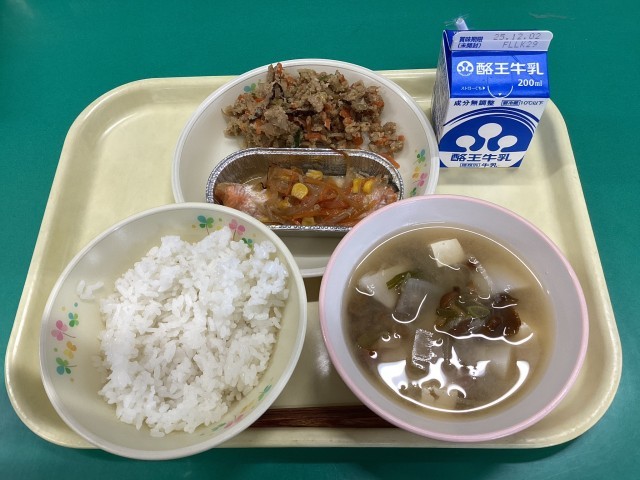 ごはん,牛乳,鮭のちゃんちゃん焼き,うの花いり,なめこ汁