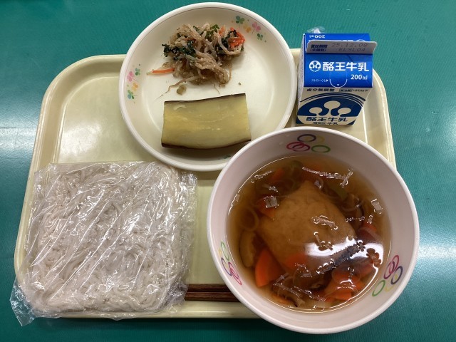 きつねうどん,牛乳,ふかし芋,ほうれん草ともやしのごまあえ
