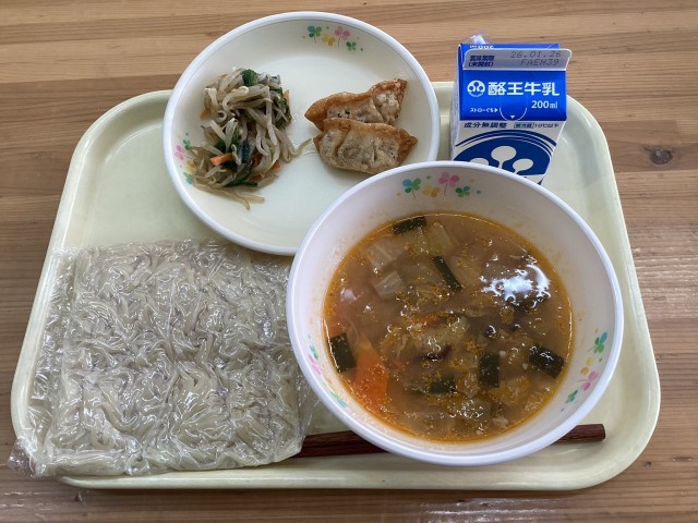 からしみそタンメン,牛乳,揚げぎょうざ,もやしのラー油あえ